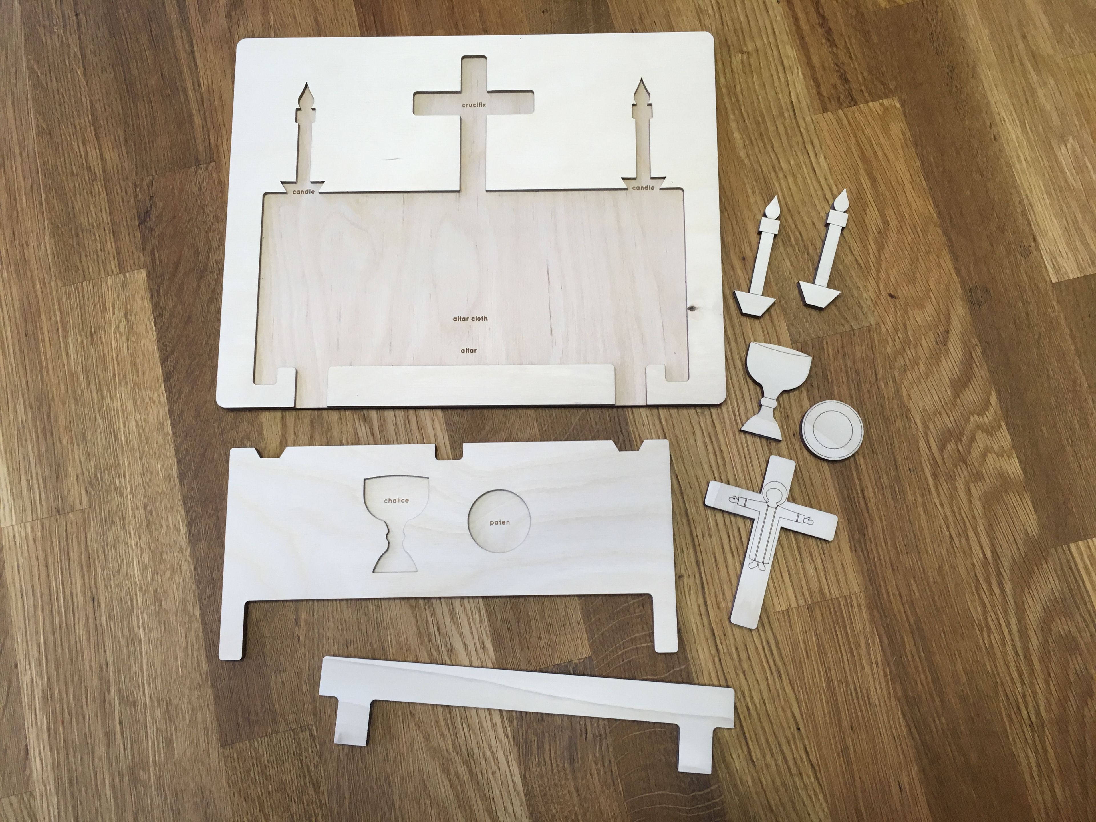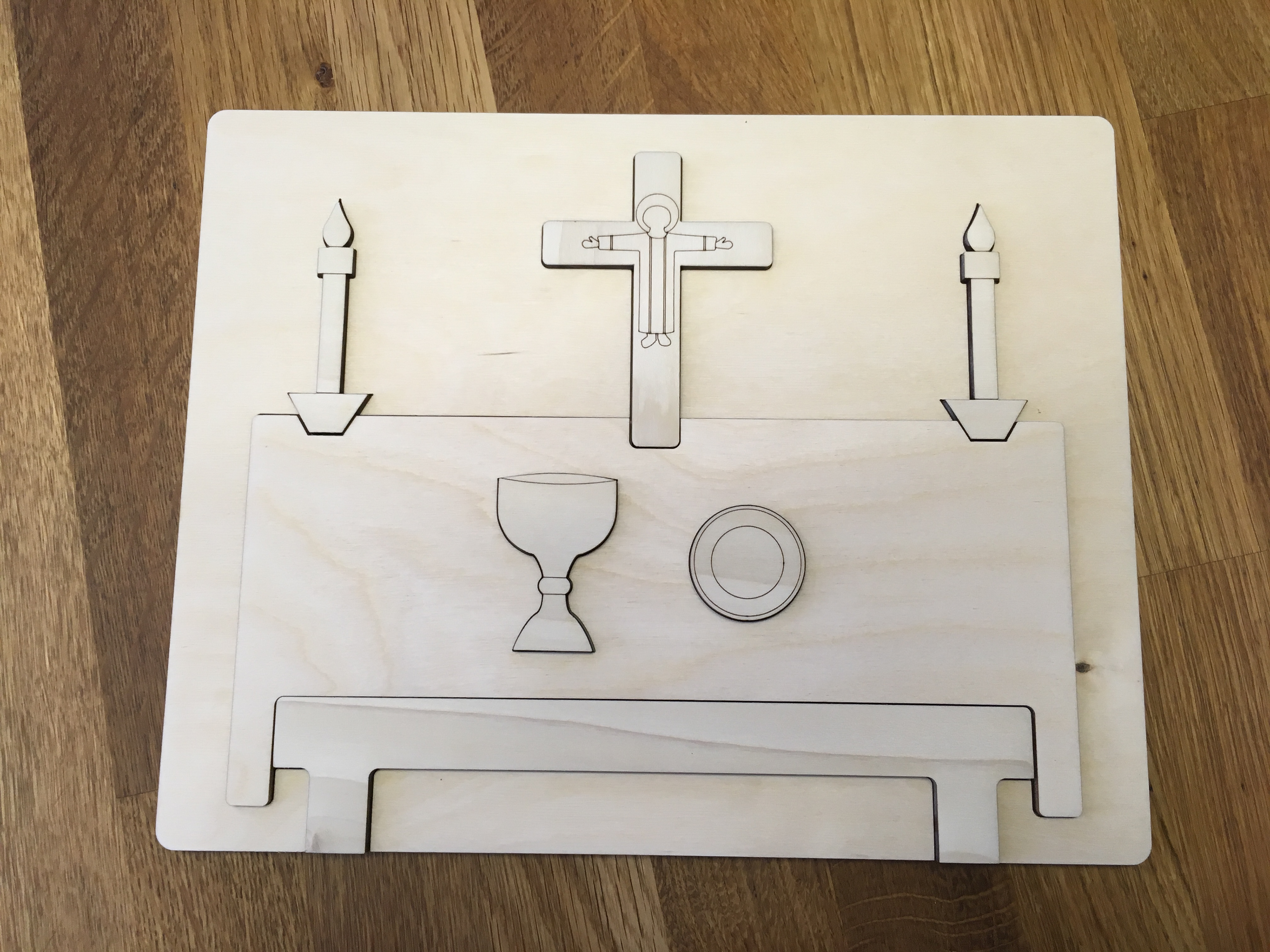 There are children's puzzles for so many things, why not for our Catholic faith! This puzzle was created to let children learn about the parts of the altar at mass. It includes the altar, altar cloth, paten, chalice, 2 candles, and a crucifix. The pieces sit higher than the surrounding frame so children can easily place and remove them. The candles, crucifix, altar cloth, and altar pieces fit into the frame while the chalice and paten pieces fit onto the removable altar cloth piece. The name of each altar article is laser engraved onto the frame under each puzzle piece.