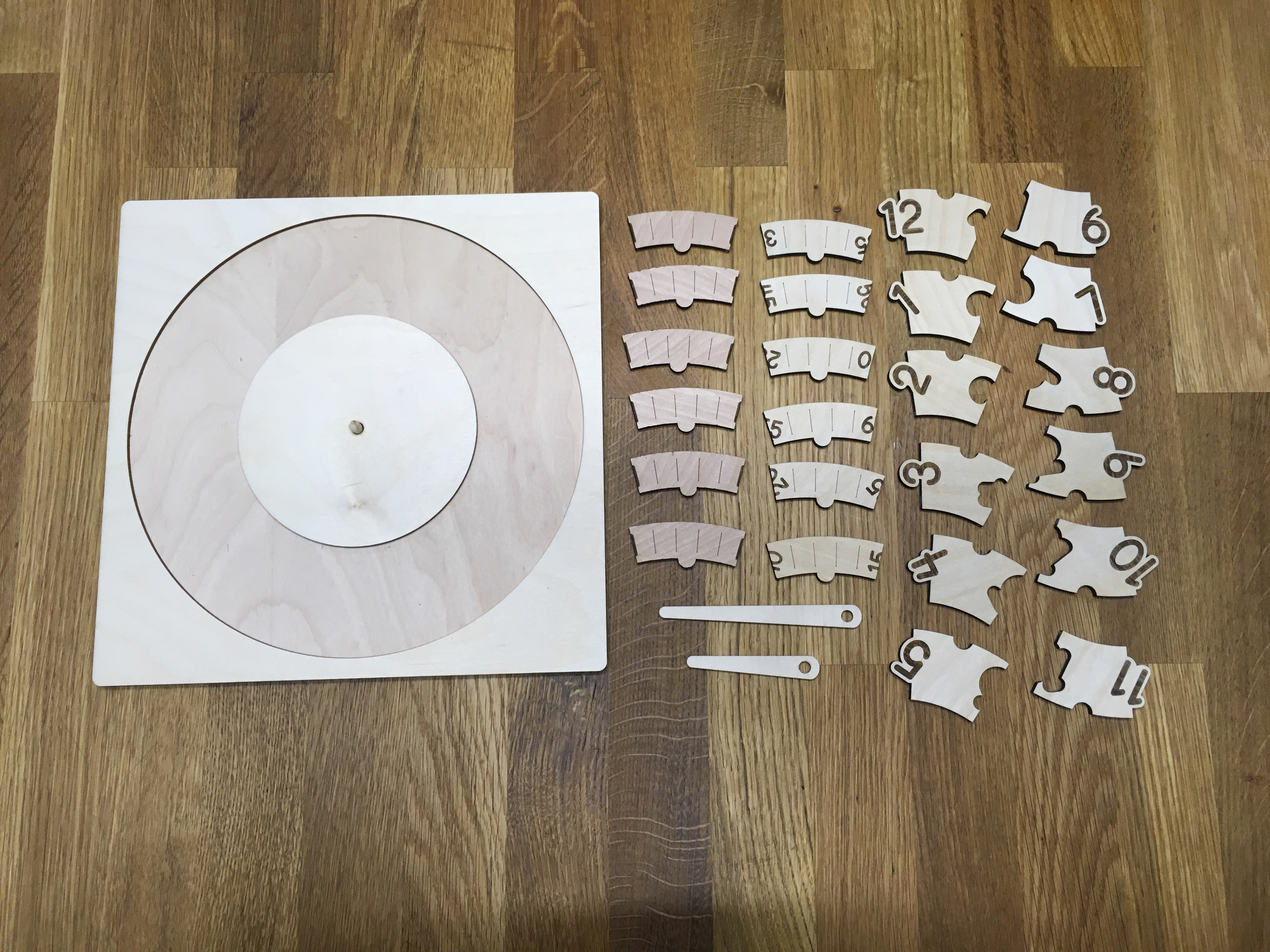 Pieces and frame are made from birch plywood, sanded smooth in the natural unfinished condition. All markings are laser engraved. Hour and minute pieces are thicker than the frame to aid little fingers in placing and removing pieces. Frame measures 10.75" square. Clock comes with 12 minute ring pieces, 12 hour pieces, and two clock hands.