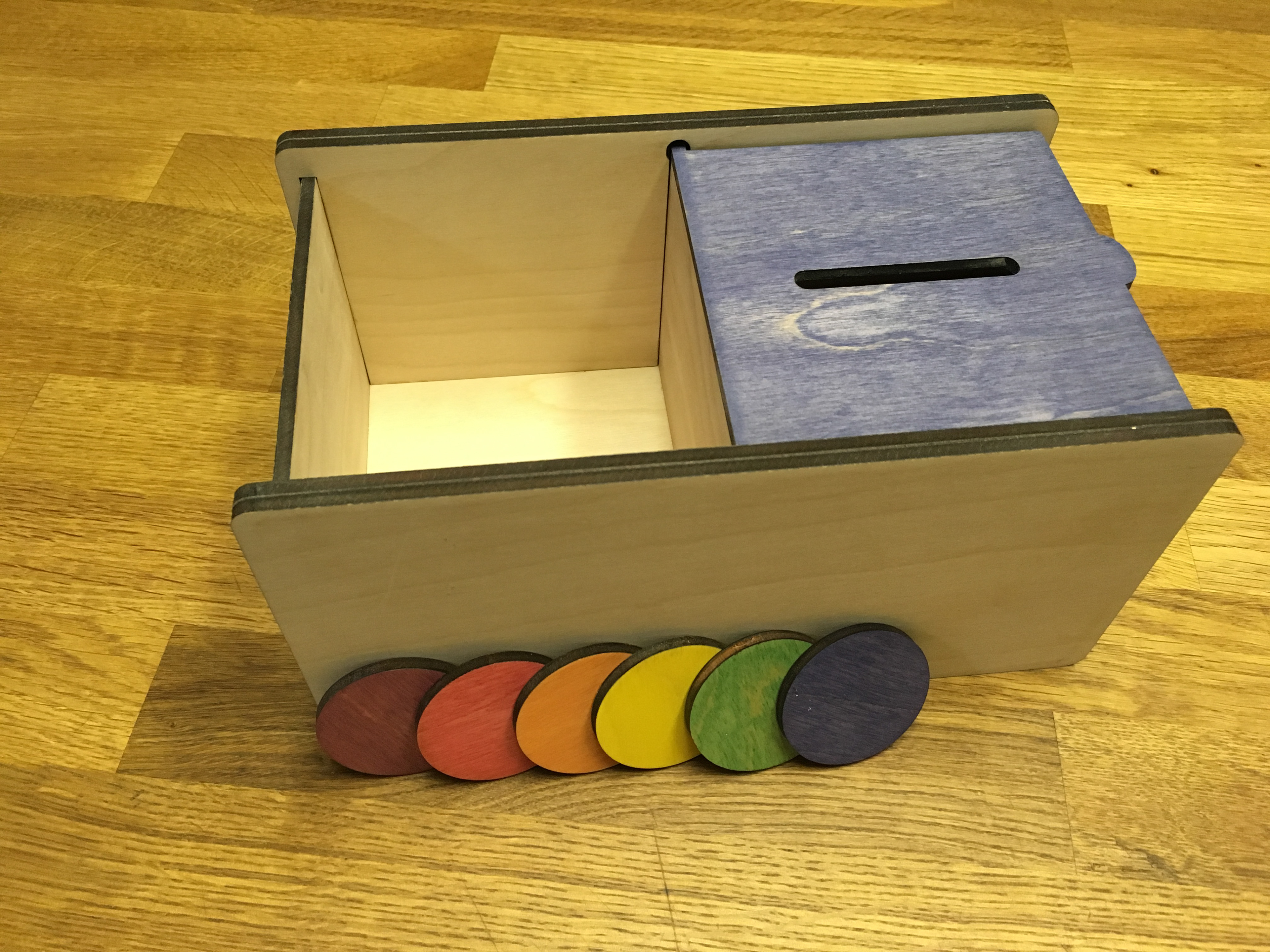 Box measures 10" long, 6" wide, 5" high. 6 coins are included which are each 2" in diameter. Box and coins are made from birch plywood. Coins and lid are stained with vibrant colors and then sealed, providing color while still allowing the beautiful wood grain to show through. Box is left in natural unfinished condition. Lid can be stained in any of the six coin colors shown.