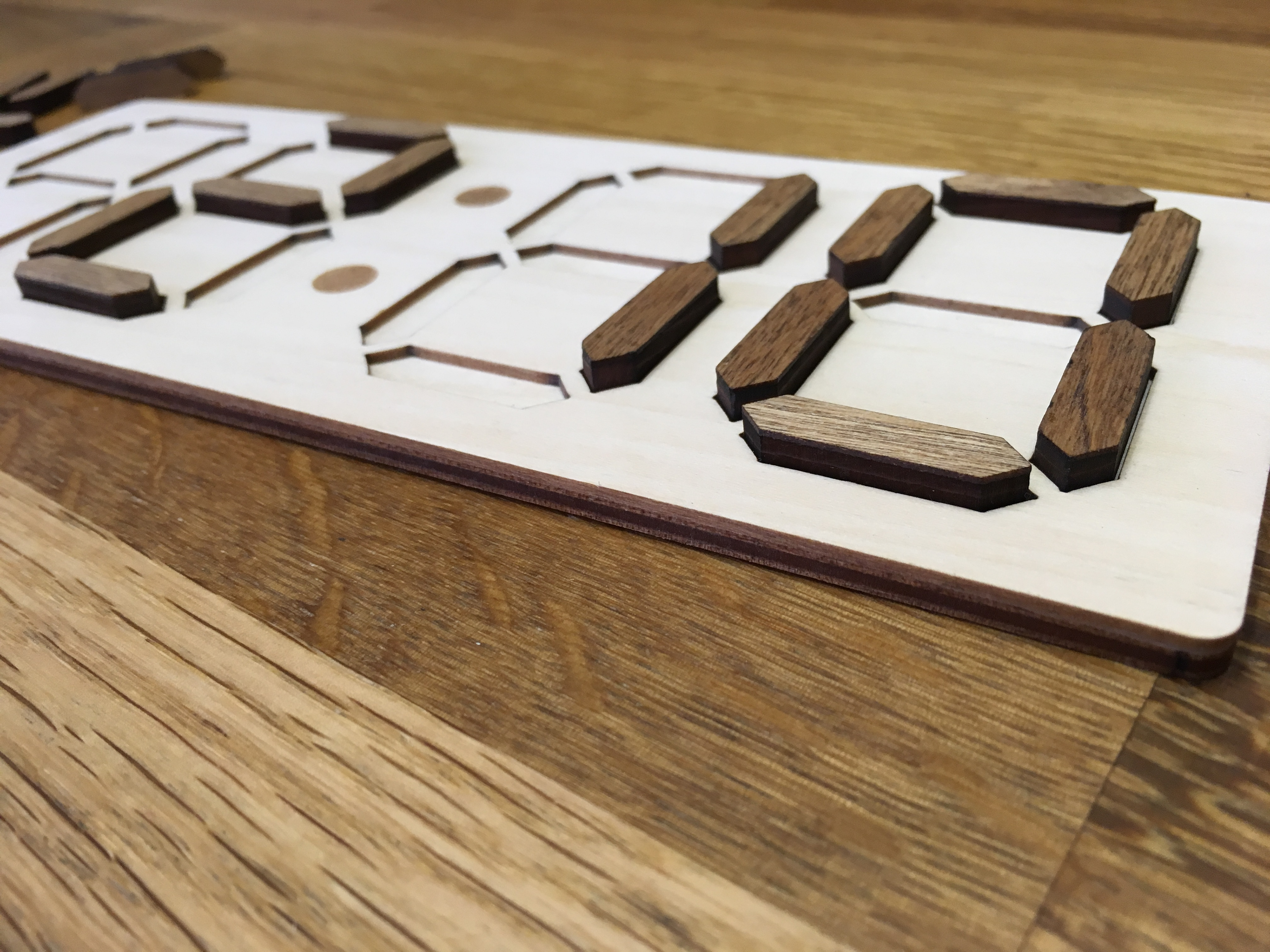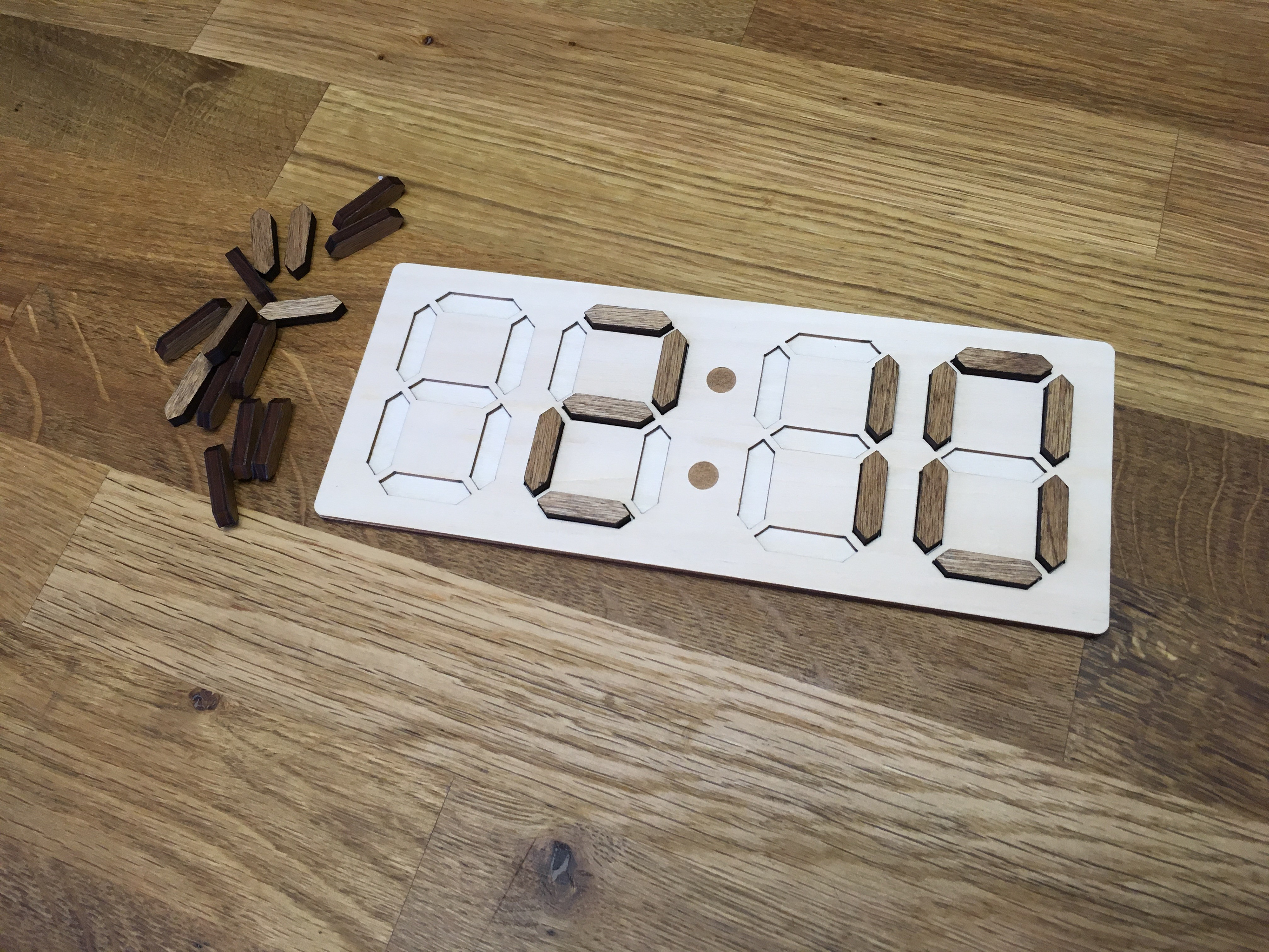 The digital clock display frame is made from birch plywood and basswood, both sanded smooth and left in their natural unfinished states. The LCD segments are made from birch plywood and then stained and sealed to provide contrast with the display frame. Frame measures 3.6" high by 9" wide and each LCD segment is a bit longer than 1". Due to the small pieces, this work is not recommended for younger children.