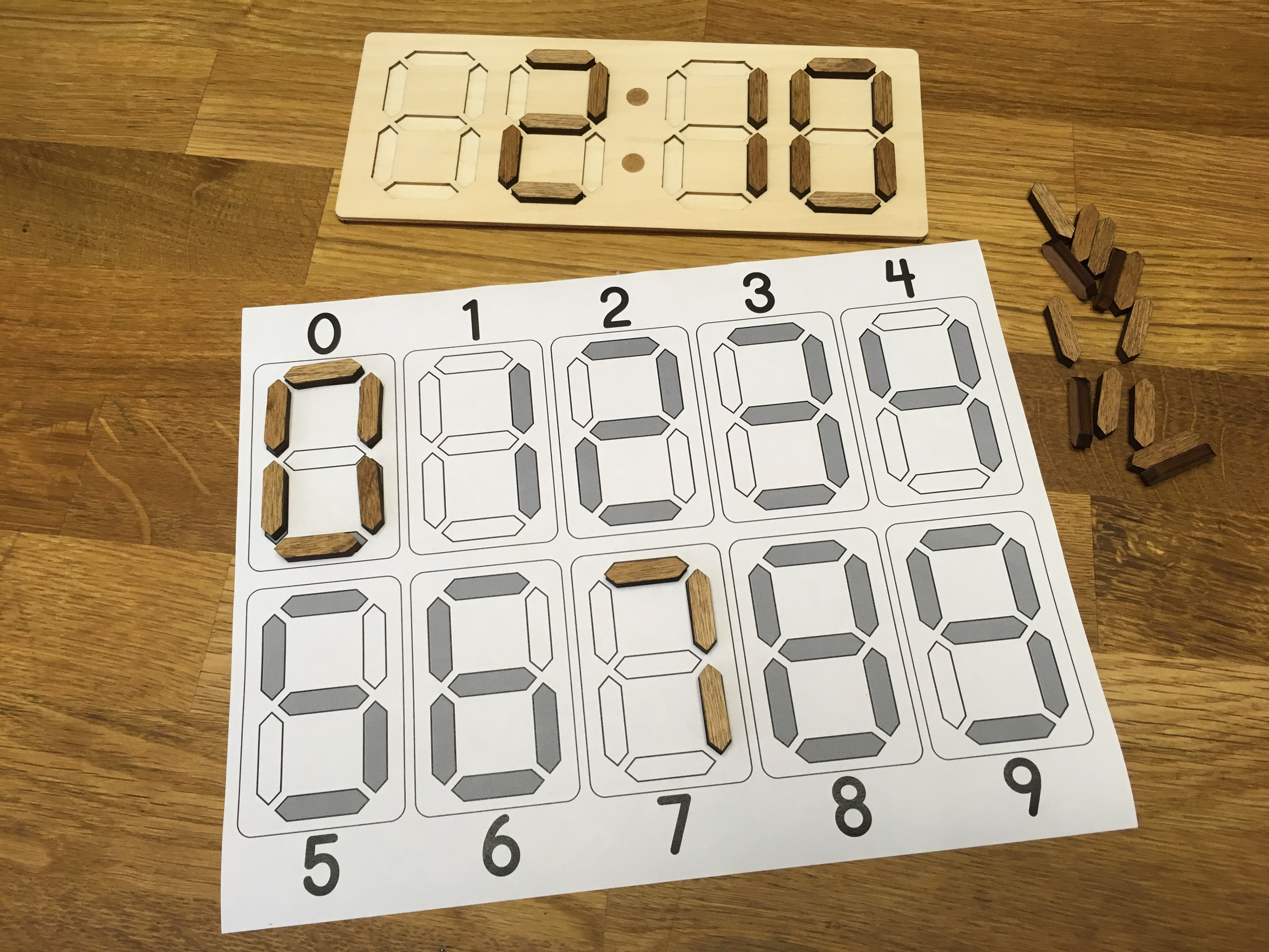 So much of our time is measured with digital clocks these days, so this is an interesting work to get children familiar with recognizing numbers and time in a digital format. Children can first use the LCD segments to build individual numbers using an included digital print-at-home file. There are enough LCD segments provided in the set to build all 10 numerals at one time. Then the child can start building numbers and times on the digital clock display frame. Each LCD segment has its own slot and sits higher than the frame, so little fingers can easily place and remove the segment without disturbing surrounding pieces.