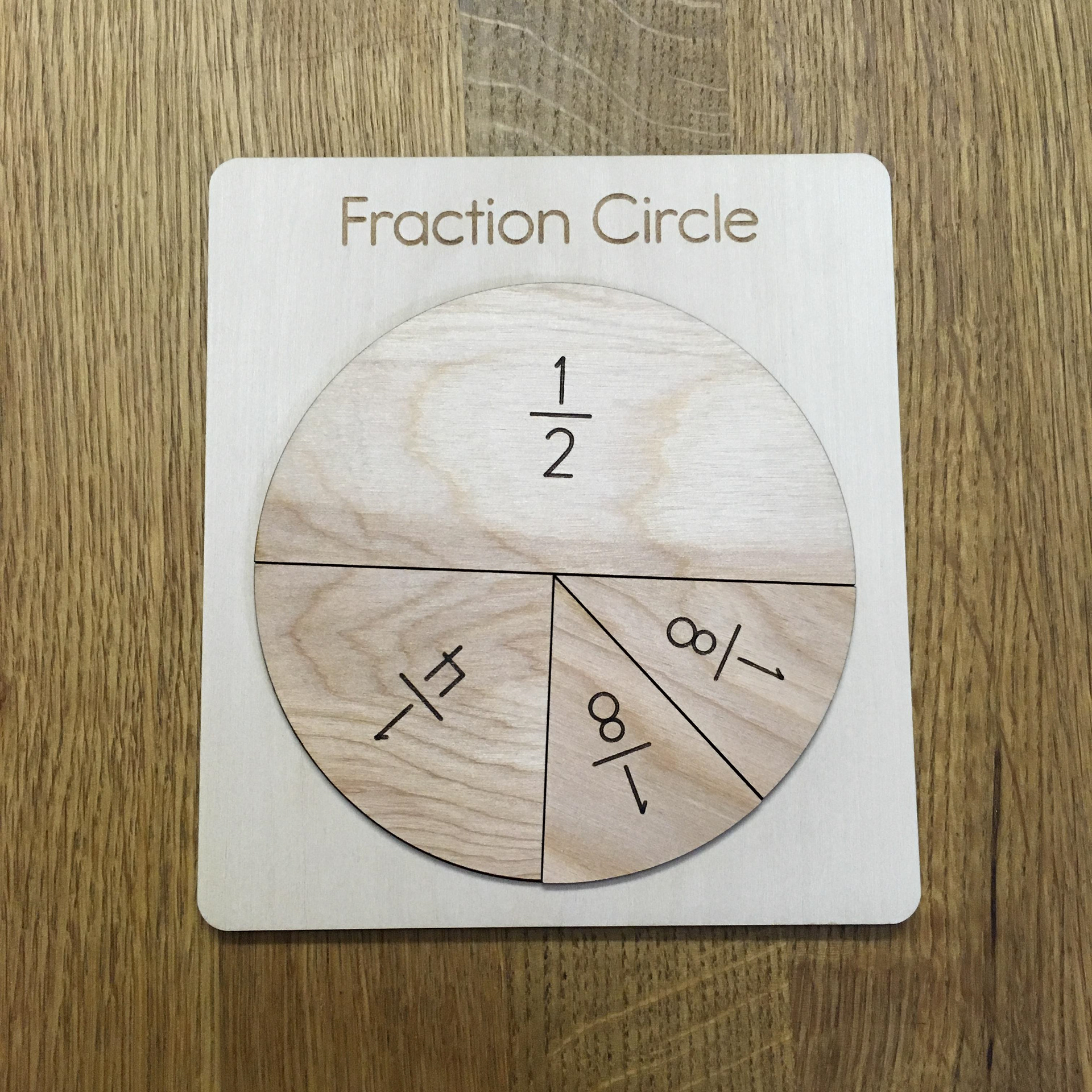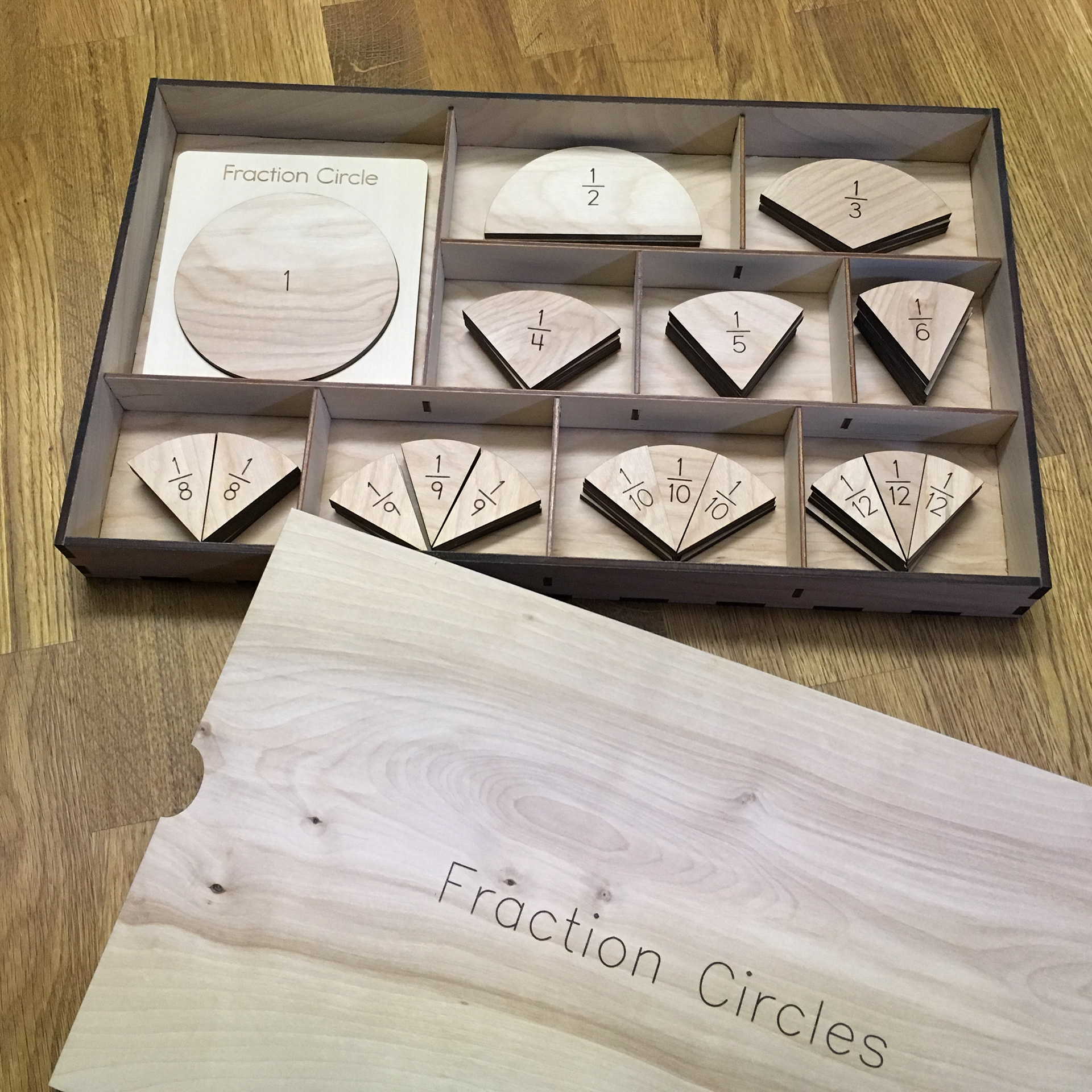 Fraction circle box measures just shy of 17.5" long, 10.5" wide, and 1.75" tall. Each fraction circle measures 4.5" in diameter. Fraction circle frame measures 5.3" wide by 5.9" high. All pieces are made from birch plywood, sanded smooth and left in the unfinished natural condition.