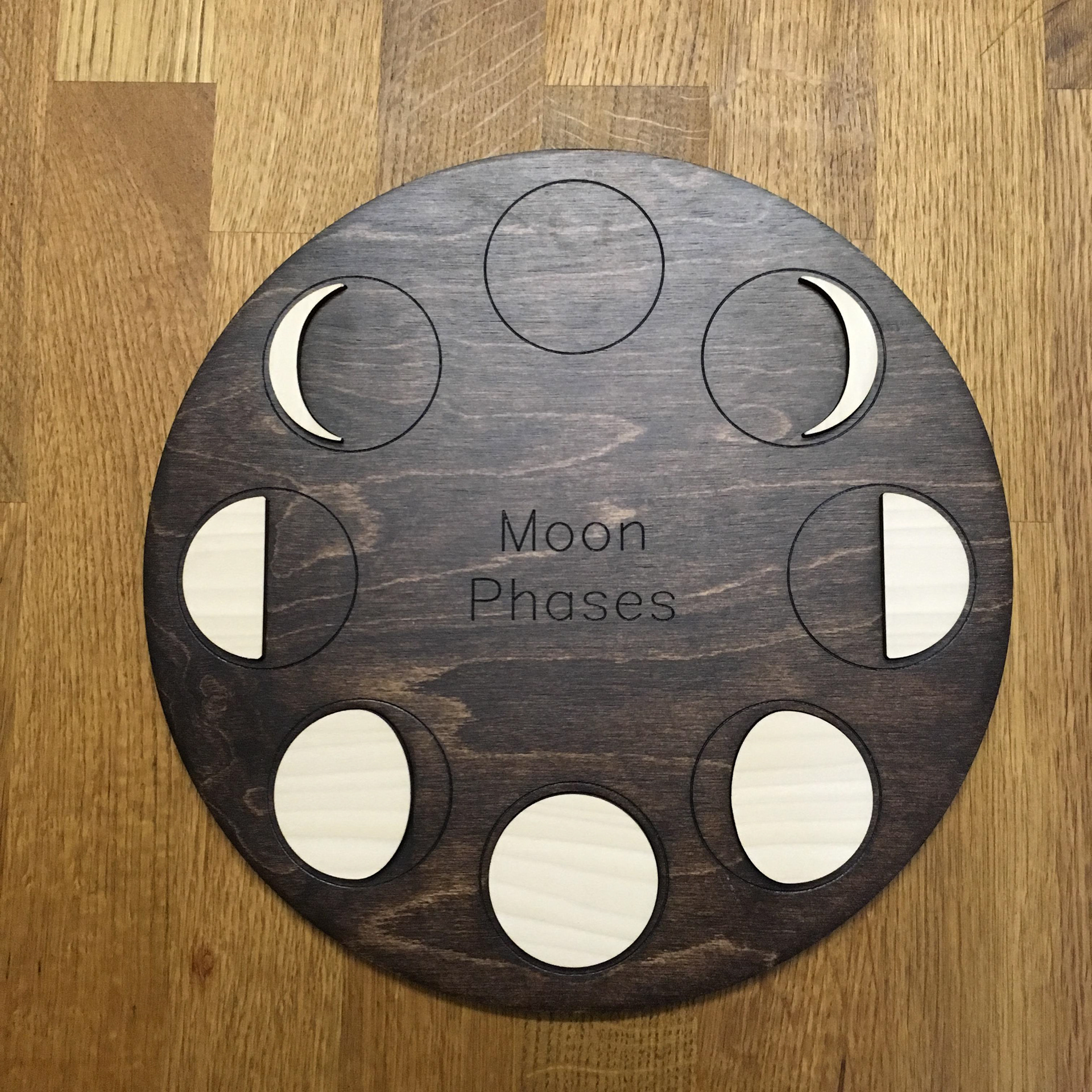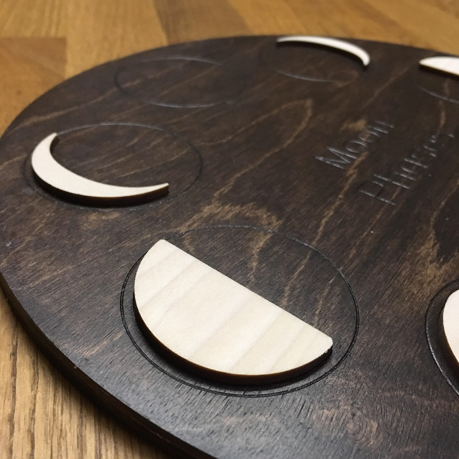 The puzzle frame is made from birch plywood, stained darkly to imitate the dark night sky, and then sealed. Moon puzzle pieces are made from poplar, sanded smooth and left in the natural unfinished state. The pieces are thicker than the puzzle frame to aid in placing and removing the pieces in the frame. Frame diameter is 10.5" and moon puzzle pieces are about 2" high.