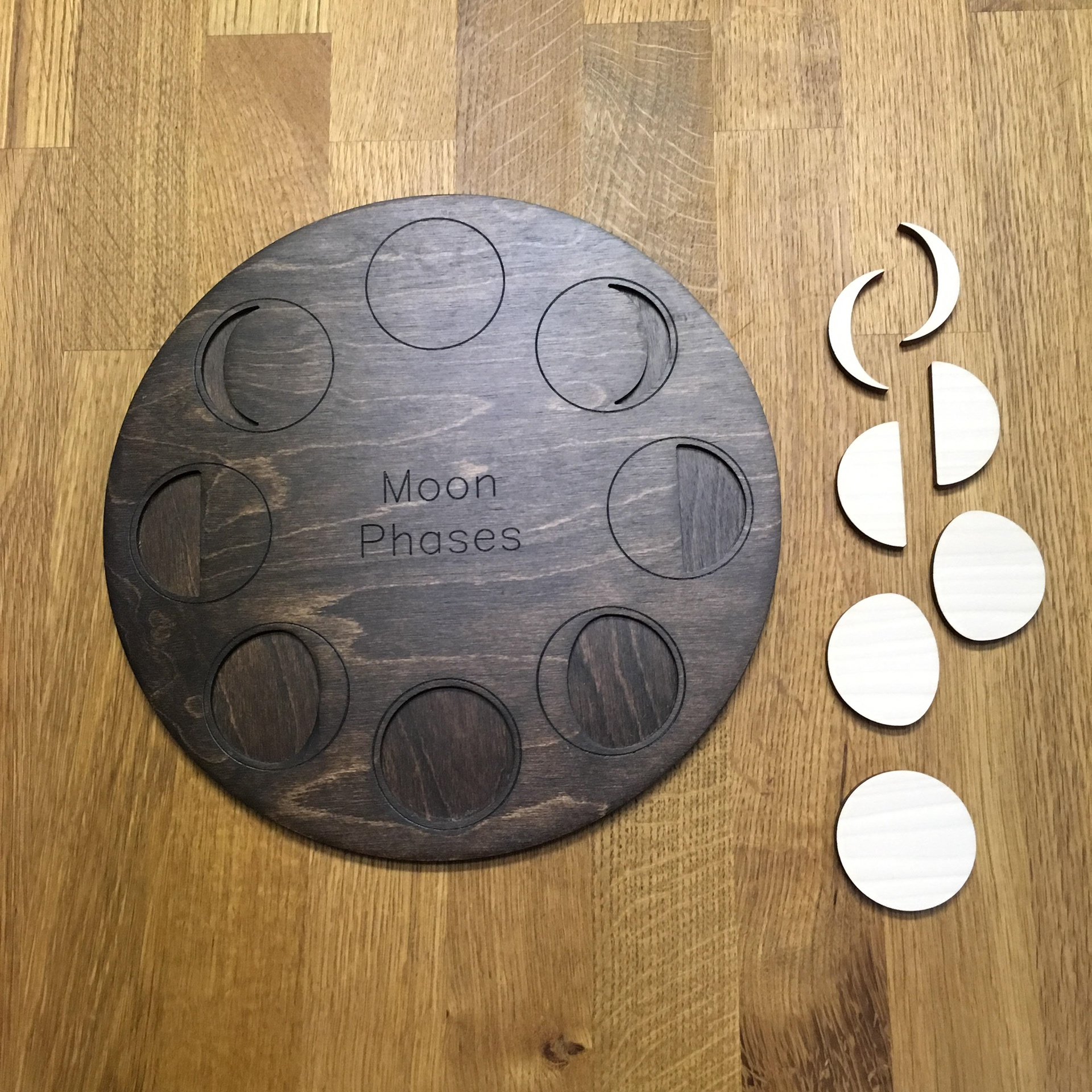 A simple moon phase puzzle to illustrate the cycle and shapes the moon goes through. Children can place the crescent, quarter, gibbous, and full moon shapes in the puzzle frame to learn how the moon waxes and wanes. A corresponding digital print-at-home 3-part card file is included with high resolution moon images to show all the same moon phases. Children can match the moon puzzle pieces to the cards or match the cards and labels to the completed puzzle frame.