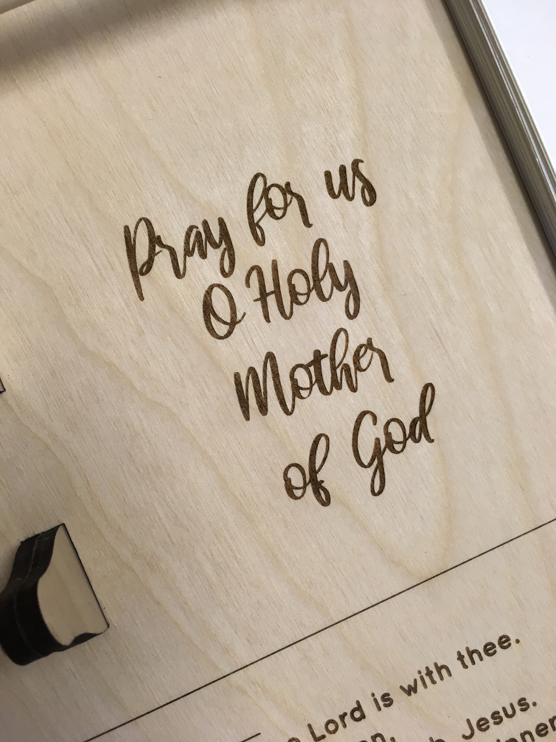 There are three different rods with wooden beads to keep track of the introductory prayers, Our Fathers, and each set of ten Hail Marys. The most frequently said rosary prayers are laser engraved on the board for children who are just learning. A laminated collection of less frequent rosary prayers and a collection of fine art imagery for all of the mysteries is on a set of book rings to be flipped throughout the rosary. The book rings also open easily, so the laminated cards can be removed from the board for rosary praying on the go. The back half of the board hinges out like an easel for table top usage. Hopefully this rosary board will inspire many family rosaries at your house!